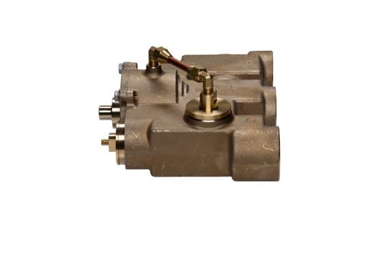 Model TWBS.HF, lead-free Emergency Valve (patent pending), thermostatically mixes hot and cold water to provide a safe fluid supply for emergency shower and eyewash equipment. The valve contains a secondary high temperature limit valve to provide additional protection to the user in the event of main tempering valve malfunction. Additionally, to ensure a fail-safe water supply for emergency shower and eyewash stations, a pressure sensing diverter valve is provided that sends a pressure signal to open the cold water by-pass valve in the event of hot water pressure loss, main valve thermostat malfunction, or clogged cold water check-stop. (No gauges supplied – ASSE 1071 standard recommends gauges be placed 5 to 8 feet (1.52 to 2.44 m) downstream for the most accurate temperature measurement.)